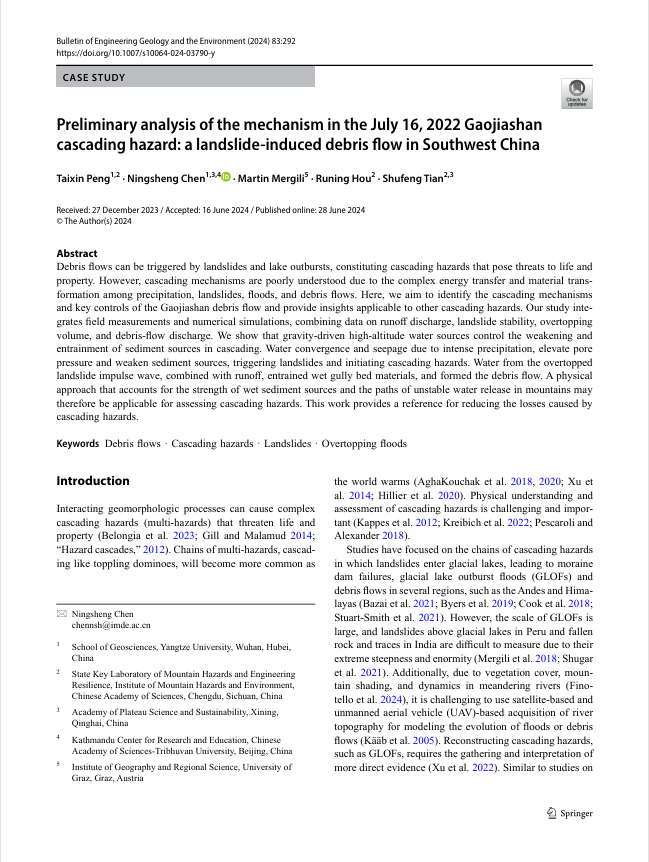地科学院陈宁生教授团队在《Bulletin of Engineering Geology and the Environment》发表了题为“Preliminary analysis of the mechanism in the July 16, 2022 Gaojiashan cascading hazard: a landslide-induced debris flow in Southwest China”的研究论文。陈宁生教授为通讯作者,威廉williamhill为第一署名单位。本研究获得国家自然科学基金重点研发项目的资助。