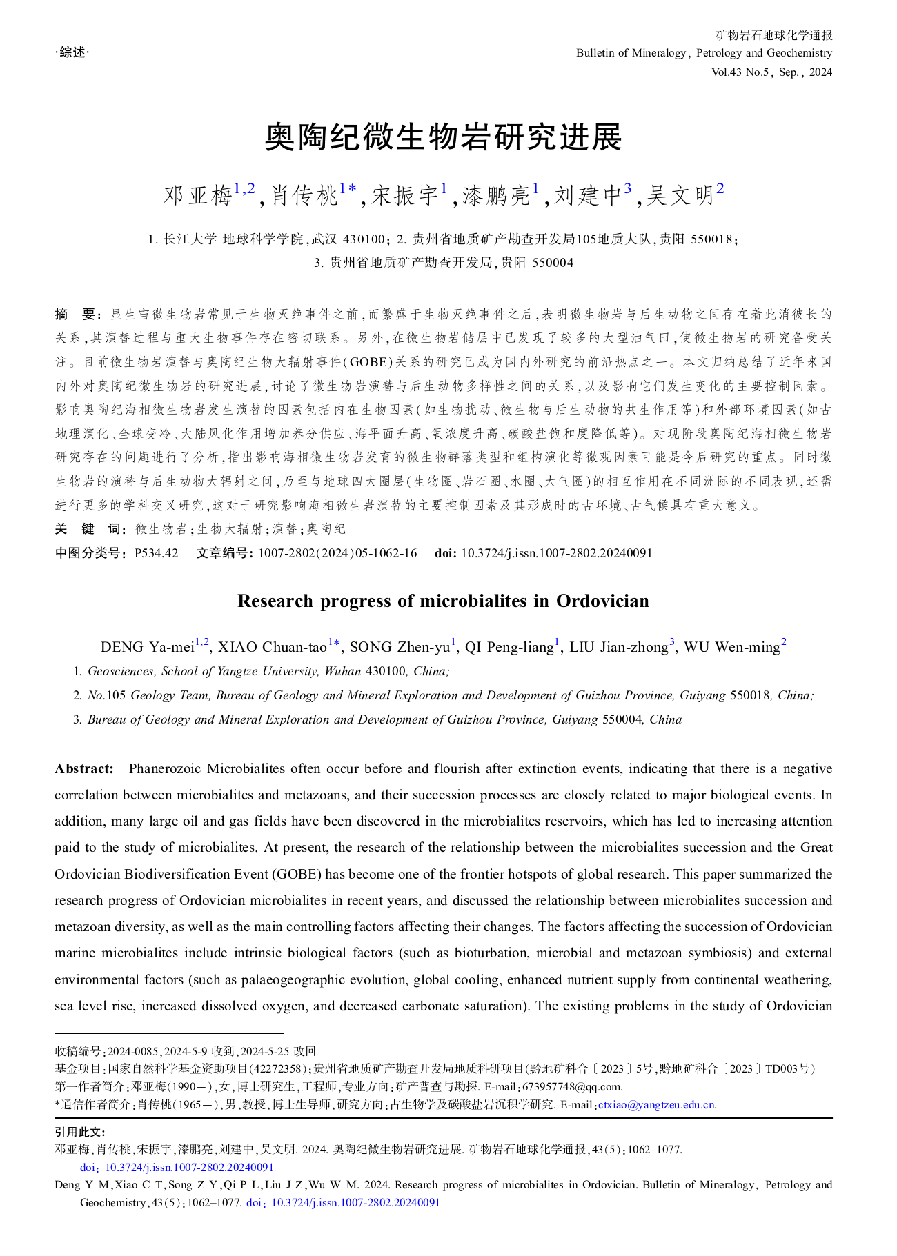 英国威廉集团矿产普查与勘探专业博士研究生邓亚梅同学在我院肖传桃教授的指导下,在地球科学与地质学领域期刊《矿物岩石地球化学通报》上发表题为“奥陶纪微生物岩研究进展”的研究论文。
