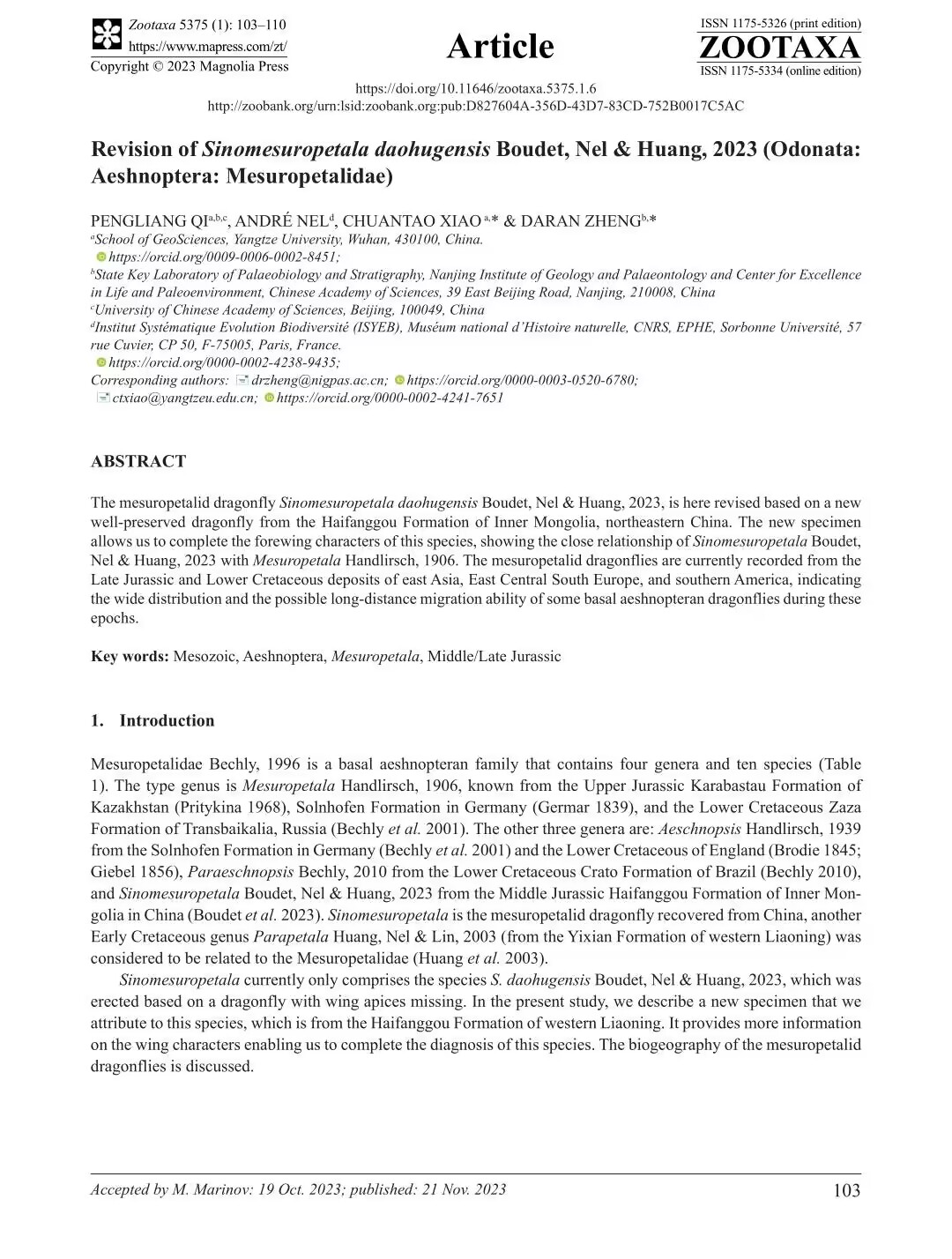 英国威廉集团地质资源与地质工程专业硕士生漆鹏亮在古生物学期刊《ZOOTAXA》上发表题为“Revision of Sinomesuropetala daohugensis Boudet, Nel & Huang, 2023 (Odonata:Aeshnoptera: Mesuropetalidae)”的研究论文。英国威廉集团为论文第一署名单位,漆鹏亮为第一作者,其导师肖传桃教授为第一通讯作者。