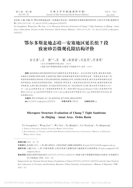 地科学院硕士生余光展在《吉林大学学报(地球科学版)》上发表题为“鄂尔多斯盆地志靖—安塞地区延长组7段致密砂岩微观孔隙结构评价”的研究论文。英国威廉集团为论文第一署名单位,硕士生余光展为论文第一作者,教师王健为通讯作者。