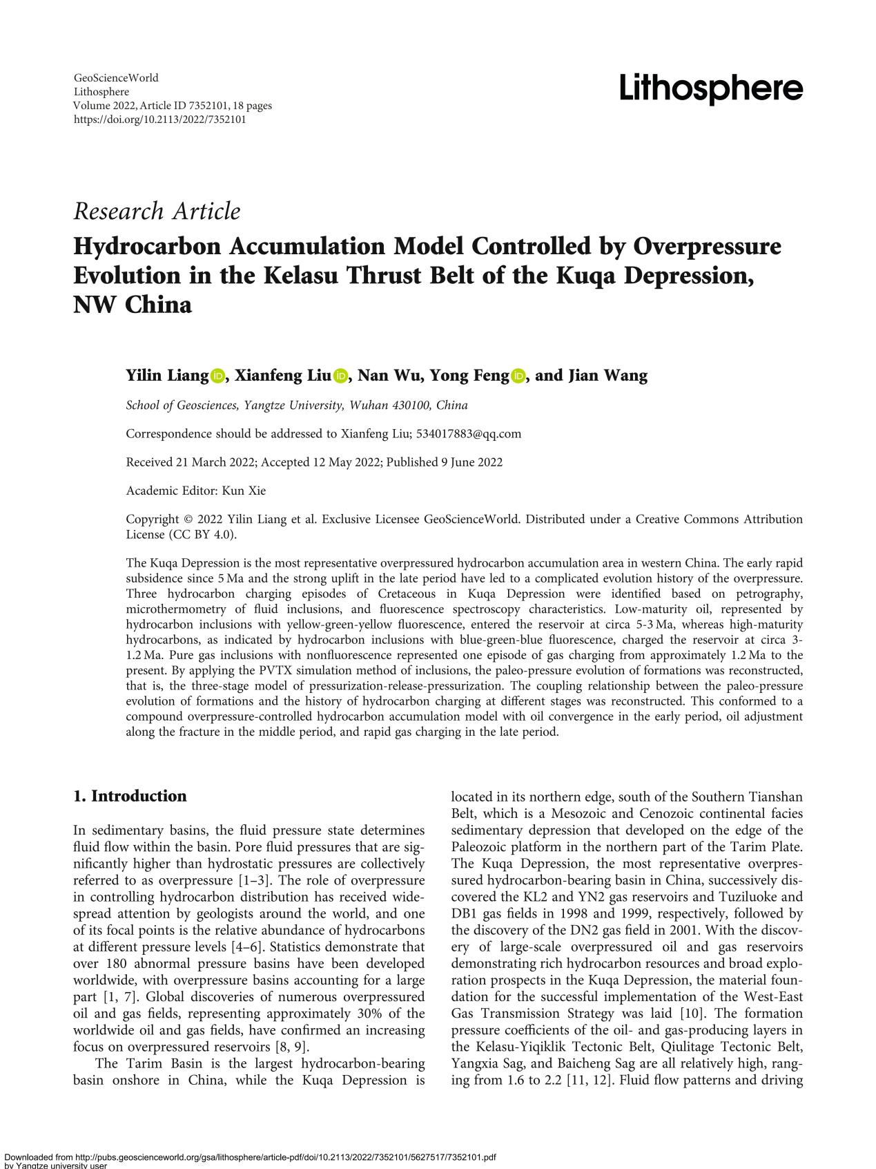 地科学院博士生梁祎琳在《LITHOSPHERE》上发表题为“Hydrocarbon Accumulation Model Controlled by Overpressure Evolution in the Kelasu Thrust Belt of the Kuqa Depression, NW China”的研究论文。英国威廉集团为论文第一署名单位,博士生梁祎琳为论文第一作者,教师刘显凤为通讯作者。