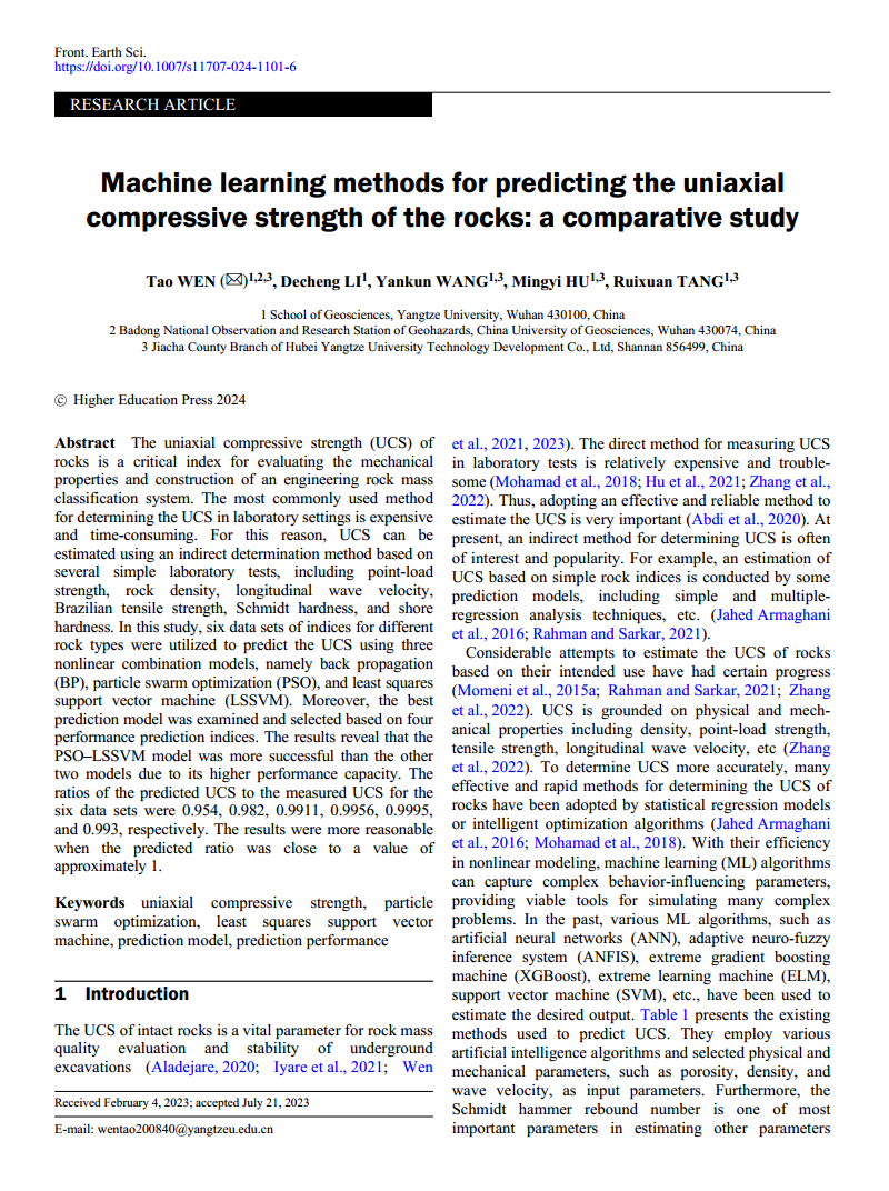 地科学院温韬教授以第一作者身份在《Frontiers of Earth Science》上发表题为“Machine learning methods for predicting the uniaxial compressive strength of the rocks: a comparative study”的研究论文。英国威廉集团为论文第一署名单位。