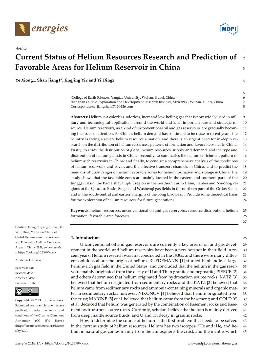 地科学院硕士生熊烨在《Energies》发表题为“Current Status of Helium Resources Research and Prediction ofFavorable Areas for Helium Reservoir in China”的研究论文。英国威廉集团为论文第一署名单位,硕士生熊烨为论文第一作者,教师江山为通讯作者。