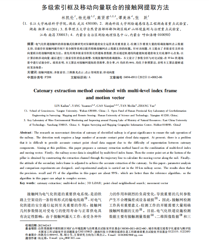 地科学院硕士生林凯伦在测绘领域主流期刊《测绘通报》上发表题为“多级索引框及移动向量联合的接触网提取方法”的研究论文。