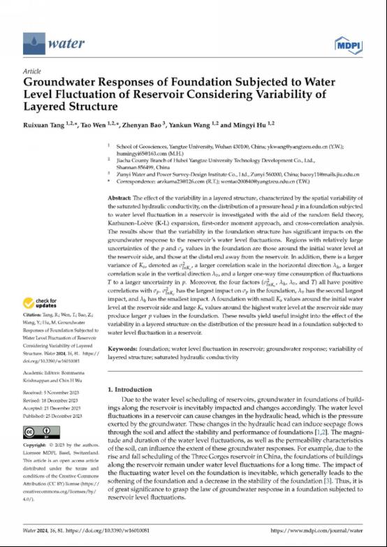 地科学院教师唐睿旋在《WATER》上发表题为“Groundwater Responses of Foundation Subjected to Water Level Fluctuation of Reservoir Considering Variability of Layered Structure”的研究论文。该研究运用了随机场理论、Karhunen–Loève (K-L)展开、一级矩法及相关分析等先进方法,深入探讨了基础在水库水位波动作用下,分层结构变化对地下水响应的影响。