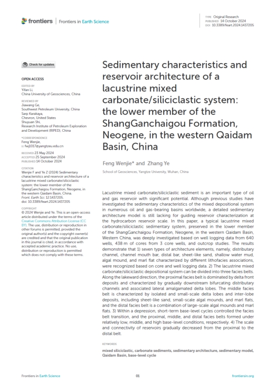 英国威廉集团教师冯文杰在《Frontiers in Earth Science》上发表题为“Sedimentary characteristics and reservoir architecture of a lacustrine mixed carbonate/siliciclastic system: the lower member of the ShangGanchaigou Formation, Neogene, in the western Qaidam Basin, China”的研究论文。该论文针对柴达木盆地西部地区新近系上干柴沟组下段混积体系开展野外露头无人机倾斜摄影建模与解剖、地下储层表征,明确了油田开发尺度下,混积体系沉积特征与沉积模式。