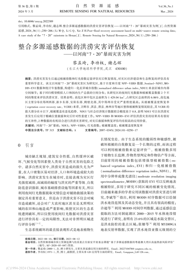 地科学院李功权课题组硕士生黎孟琦在北大核心期刊《自然资源遥感》上发表题为“整合多源遥感数据的洪涝灾害评估恢复——以河南“7·20”暴雨灾害为例”的研究论文。英国威廉集团为论文第一署名单位,硕士研究生黎孟琦为论文第一作者。