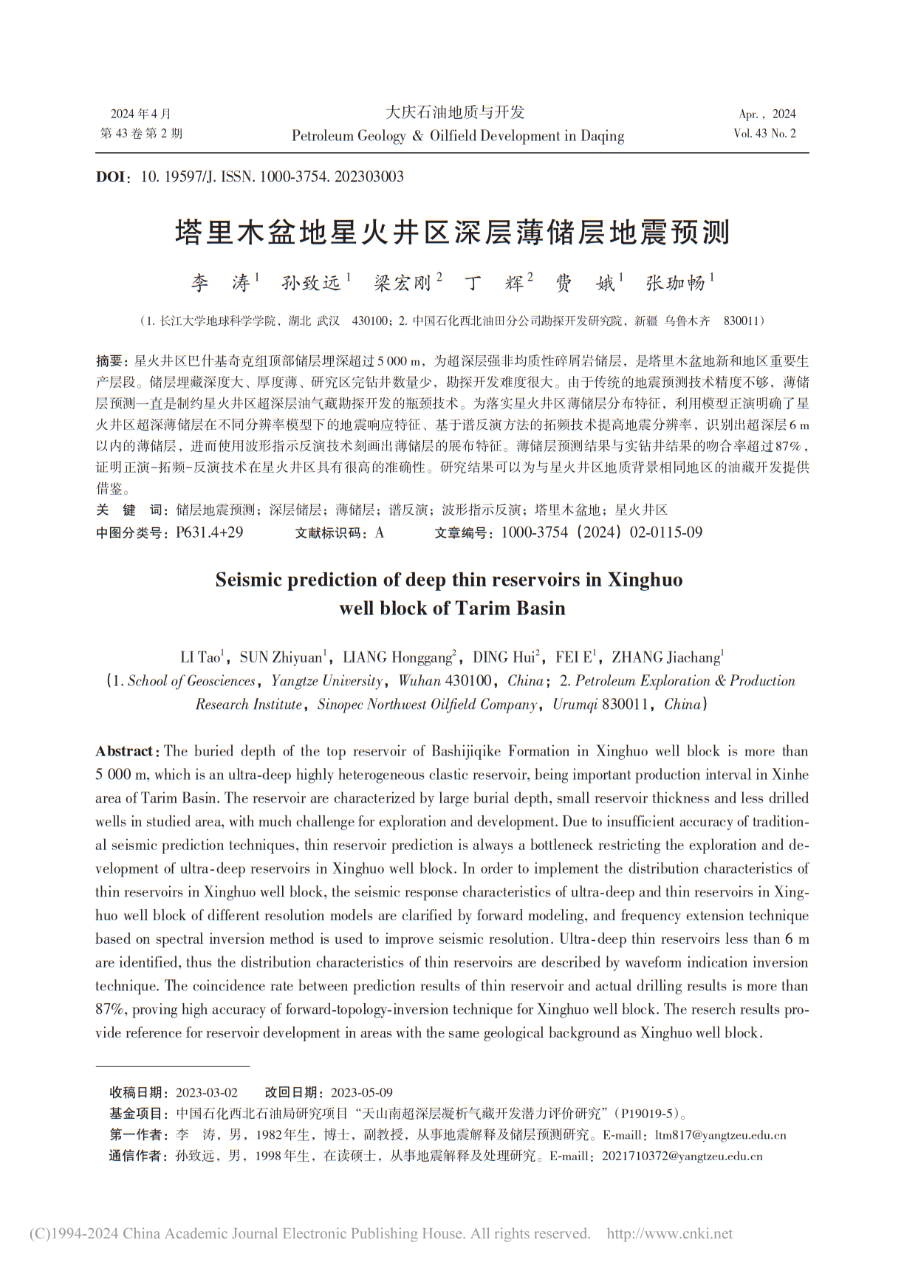 地科学院研究生孙致远以通讯作者身份在北大核心期刊《大庆石油地质与开发》上发表题为“塔里木盆地星火井区深层薄储层地震预测”的研究论文,英国威廉集团为论文第一署名单位。副教授李涛为第一作者,研究生孙致远为论文通讯作者。