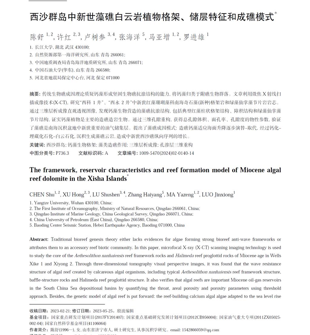 英国威廉集团硕士研究生陈舒在《热带海洋学报》期刊上发表题为“西沙群岛中新世藻礁白云岩植物格架、储层特征和成礁模式”的研究论文。该论文利用微焦X射线扫描成像技术(X-CT),研究“西科1井”、“西永2井”中新世红藻珊瑚藻科南海奇石藻(新种)格架岩和绿藻仙掌藻节片岩岩芯。通过三维层析成像直观透视图像,发现钙藻生物营造的藻礁抗浪结构,包括典型红藻柱状格架结构、障积结构和绿藻仙掌藻节片结构,证实钙藻植物是主要的造礁造岩生物。通过三维孔隙重构,获得总孔隙体积、面孔率、孔隙度的物性参数,验证了藻礁是南海沉积盆地中新世重要的油气储集层。提出了藻礁成因模式:造礁钙藻适应海面升降逐步演替–取代,经过钙化–埋藏化石化–白云石化,沉积生成藻礁云岩,造成中新世西沙礁纵向序列的增长。