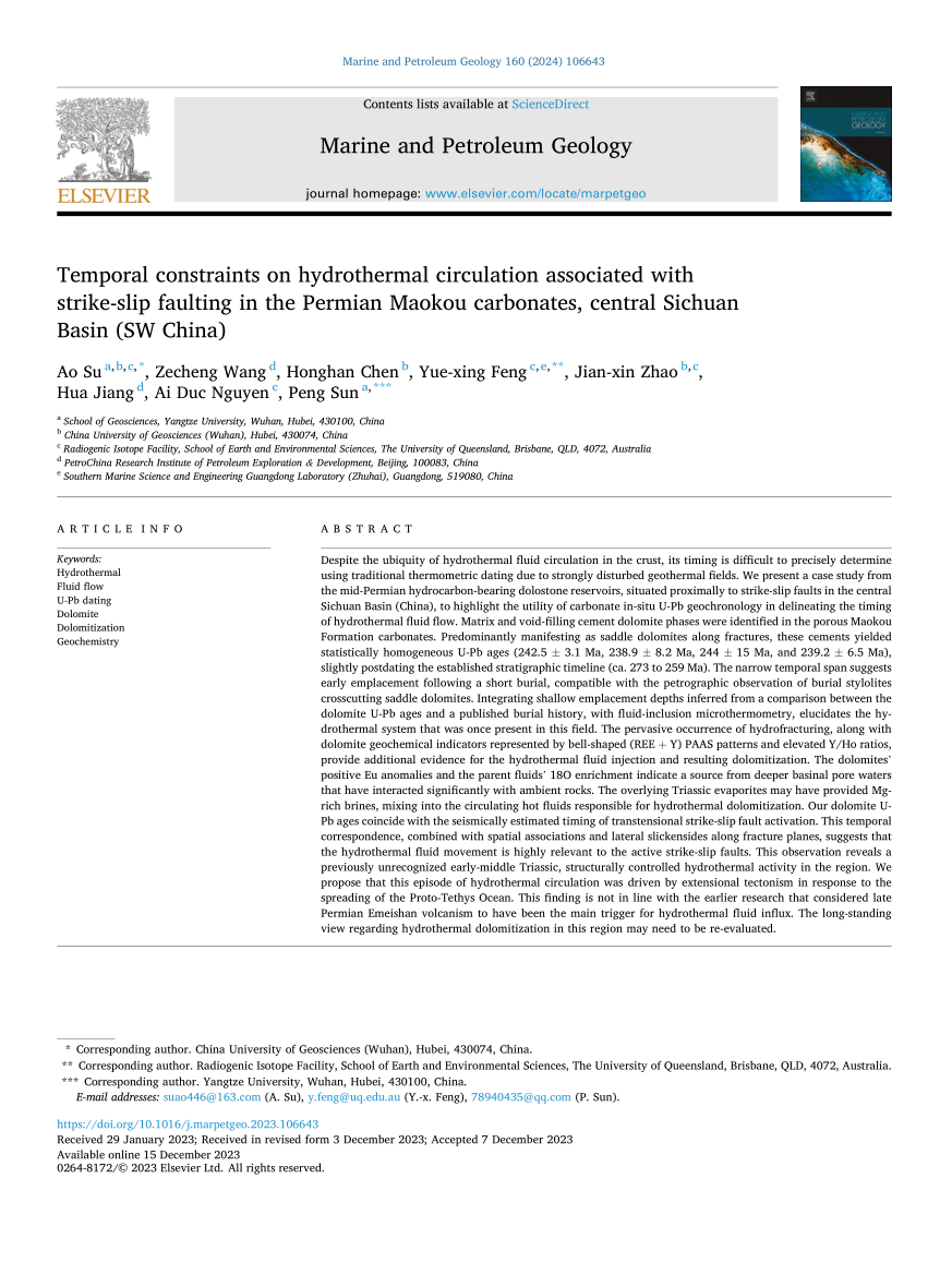 地科学院苏奥副教授在《Marine and Petroleum Geology》上发表题为“Temporal constraints on hydrothermal circulation associated with strike-slip faulting in the Permian Maokou carbonates, central Sichuan Basin (SW China)”的研究论文。英国威廉集团为论文第一署名单位。该论文深入探讨了构造活动作用下控制的热液活动模式,对该地区油气优势储层勘探具有一些参考意义。