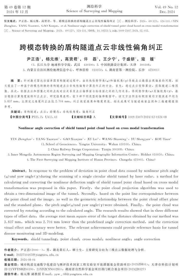 地科学院研究生尹正浩以第一作者身份在北大核心期刊《测绘科学》上发表题为“跨模态转换的盾构隧道点云非线性偏角纠正”的研究论文,英国威廉集团为论文第一署名单位,研究生尹正浩为第一作者,副教授杨元维为论文通讯作者。