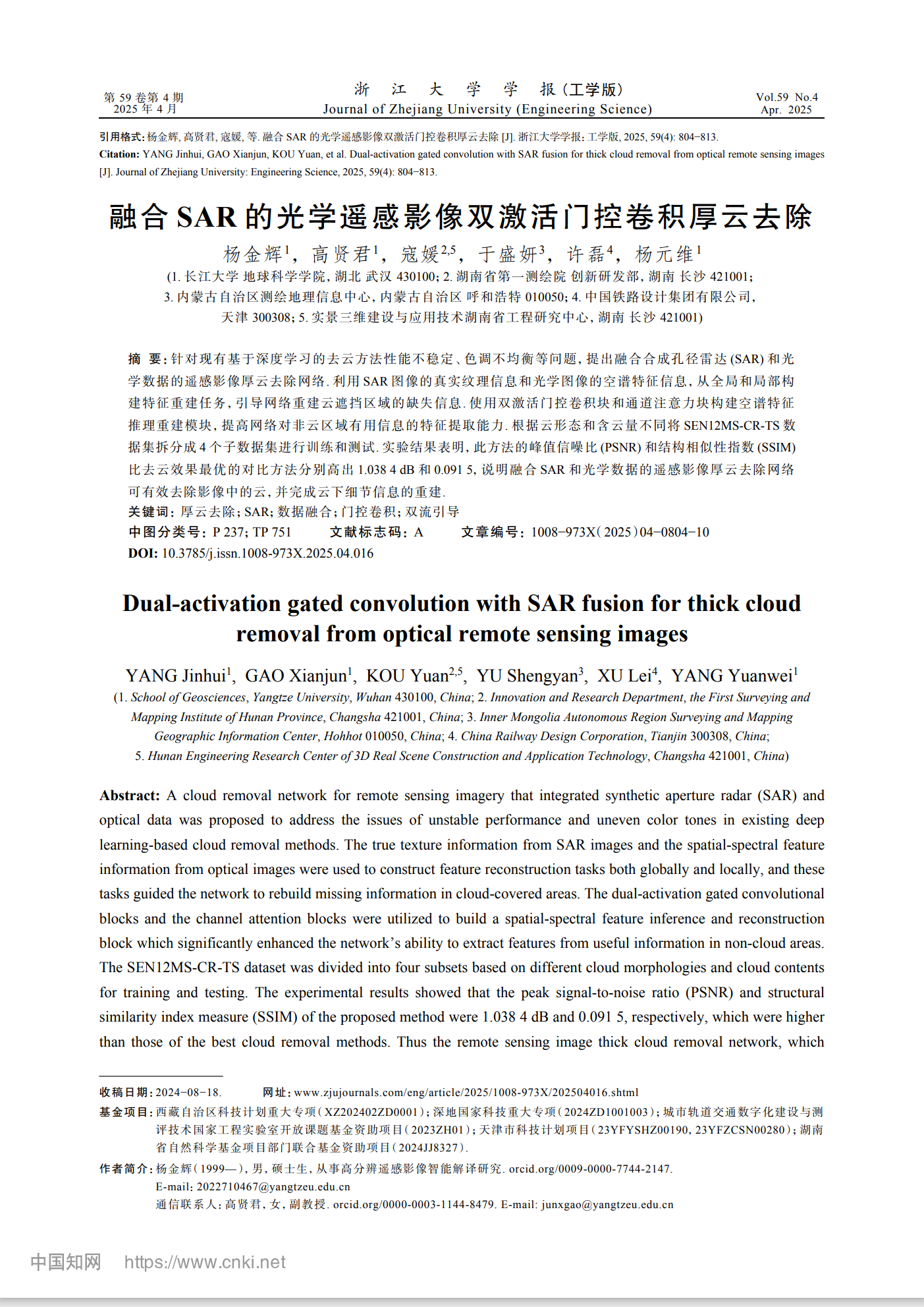 近日,英国威廉集团地图制图学与地理信息工程专业2022级研究生杨金辉在EI期刊《浙江大学学报(工学版)》发表题为“融合SAR的光学遥感影像双激活门控卷积厚云去除”的研究论文。英国威廉集团为论文第一署名单位,学生杨金辉为论文第一作者,其导师高贤君副教授为通讯作者。