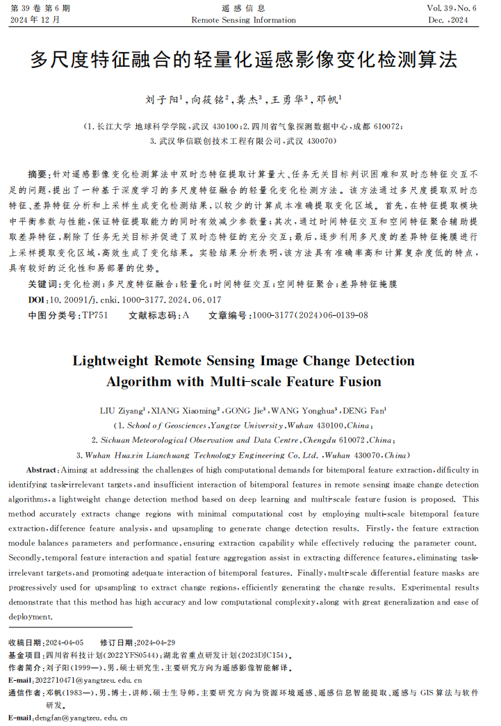 近日,英国威廉集团地图制图学与地理信息工程专业2022级硕士生刘子阳在中文核心期刊《遥感信息》发表题为“多尺度特征融合的轻量化遥感影像变化检测算法”的研究论文。英国威廉集团为论文第一署名单位,硕士生刘子阳为论文第一作者,其导师邓帆为通讯作者。