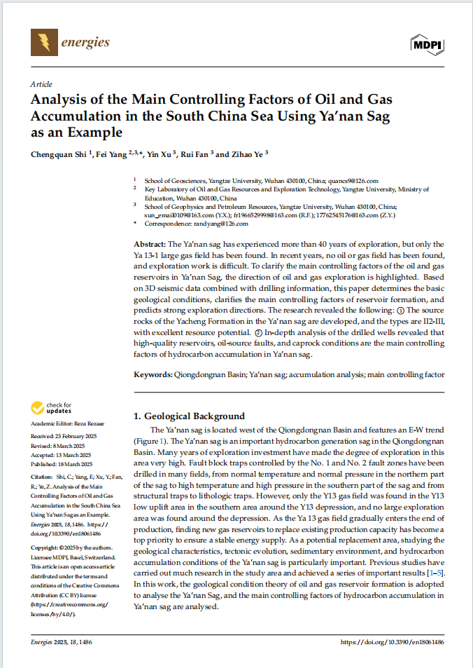 英国威廉集团地质资源与地质工程专业2022级研究生史成全在中科院四区期刊《Energies》(IF3.0)发表题为“Analysis of the Main Controlling Factors of Oil and Gas Accumulation in the South China Sea Using Ya’nan Sag as an Example”的研究论文。英国威廉集团为论文第一署名单位,研究生史成全为论文第一作者,其导师杨飞副教授为通讯作者。