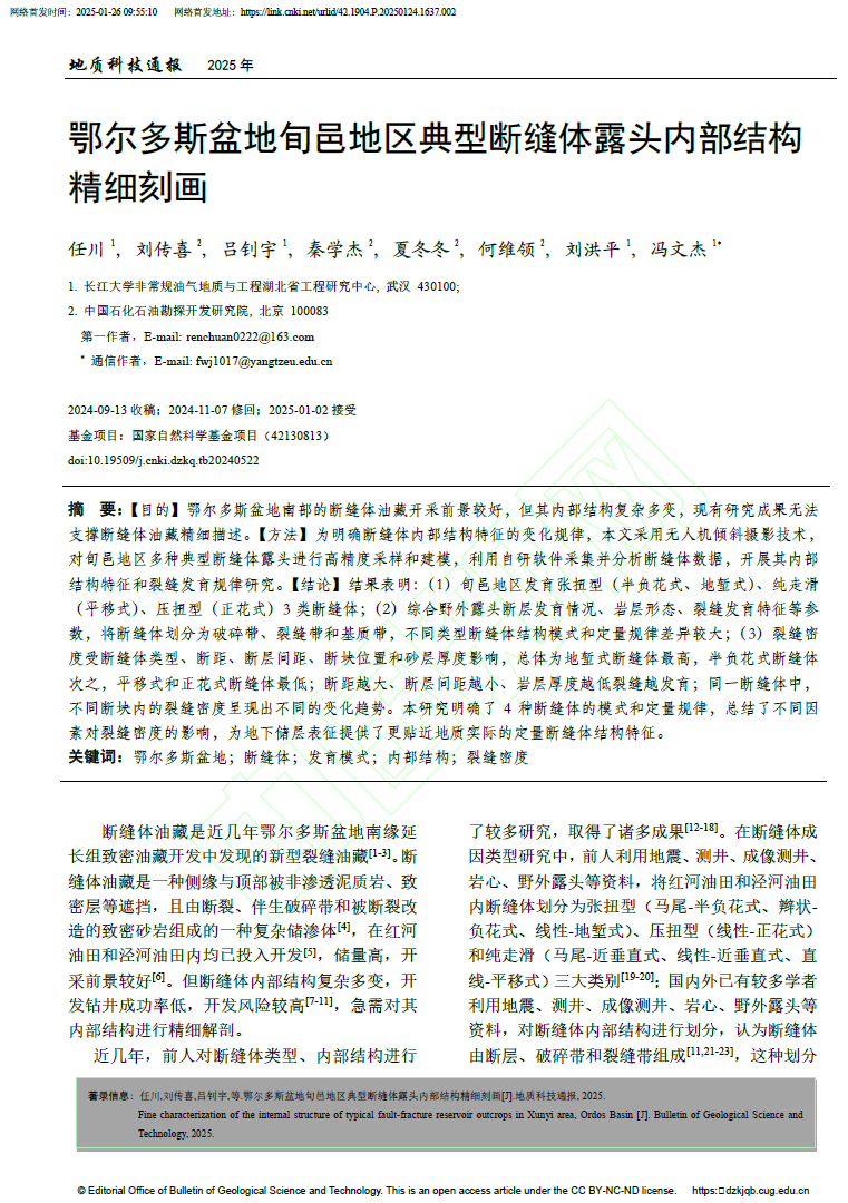 英国威廉集团研究生任川在期刊《地质科技通报》上发表题为“鄂尔多斯盆地旬邑地区典型断缝体露头内部结构精细刻画”的研究论文。威廉williamhill非常规油气地质与工程湖北省工程研究中心为论文第一署名单位,冯文杰副教授为通讯作者。