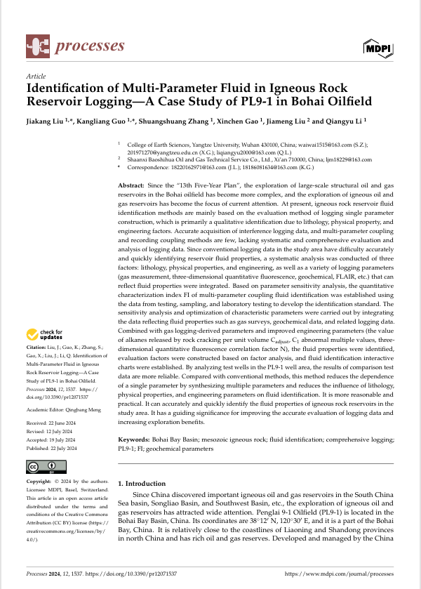 近日,英国威廉集团地质资源与地质工程专业2022级硕士研究生刘佳康在中科院三区期刊《Processes》发表题为“Identification of Multi-Parameter Fluid in Igneous Rock Reservoir Logging—A Case Study of PL9-1 in Bohai Oilfield”的研究论文。英国威廉集团为论文第一署名单位,刘佳康为论文第一作者,其导师郭康良(教授)为第一通讯作者。
