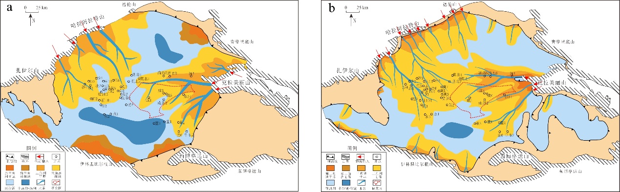 图1 东道海子凹陷下侏罗统八道湾组(a)及三工河组(b)沉积物源体系