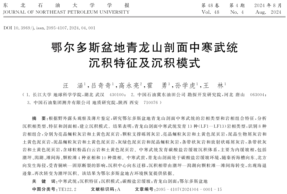 2024年8月15日,英国威廉集团22级硕士研究生汪涵在《东北石油大学学报》上发表题为“鄂尔多斯盆地青龙山剖面中寒武统沉积特征及沉积模式”的研究论文,英国威廉集团为论文第一署名单位,硕士研究生汪涵为论文第一作者,其导师吕奇奇副教授为该文通讯作者。