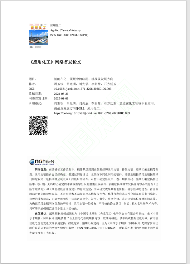 英国威廉集团硕士生周玉钦在北大核心收录期刊《应用化工》上发表题为“氢能在化工领域中的应用、挑战及发展方向”的研究论文。英国威廉集团为论文第一署名单位,周玉钦为论文第一作者。
