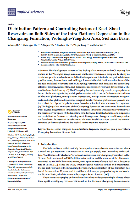 英国威廉集团硕士生毕宇航在SCI收录期刊《Applied Sciences》上发表题为“Distribution Pattern and Controlling Factors of Reef–Shoal Reservoirs on Both Sides of the Intra-Platform Depression in the Changxing Formation, Wolonghe-Yangduxi Area, Sichuan Basin”的研究论文。英国威廉集团为论文第一署名单位,胡忠贵教授为第一通讯作者,论文由国家科技重大专项基金项目资助。