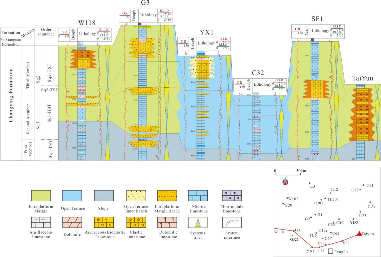图2 蓬溪-武胜台洼两侧长兴组连井沉积相对比剖面