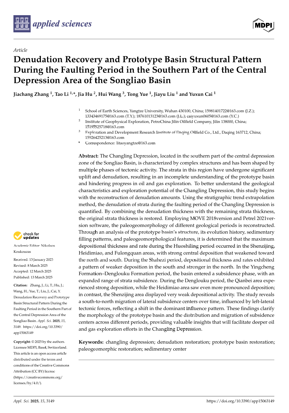 地科学院硕士研究生张珈畅在《applied sciences》上发表题目为“Denudation Recovery and Prototype Basin Structural Pattern During the Faulting Period in the Southern Part of the Central Depression Area of the Songliao Basin”的研究论文。英国威廉集团为论文第一署名单位。研究生张珈畅为第一作者,李涛副教授为论文通讯作者。该研究从剥蚀量恢复入手,采用地层趋势外推法计算了长岭断陷断陷期地层的剥蚀量,恢复了原始地层厚度,重建了不同时期的古地貌。研究结果表明:火石岭期最大沉积厚度和沉积速率发生在中部神字井洼槽,向南北方向减弱;在沙河子期,沉积厚度和速率呈现出南弱北强的格局;营城组-登娄库组时期,地层沉降幅度加大,登娄库期乾北、黑帝庙地区沉积强烈,神字井地区逐渐减弱,横向沉降中心体现出由南向北迁移的迁移特征,明确了其受左旋作用的影响,这项研究将剥蚀恢复和古地貌学相结合,从而准确重建了长岭断陷的原型盆地形态,通过分析不同时期的沉降中心及分布规律,提出了洼槽差异性演化概念,解决了研究的局限性,建立了完善的地质框架,提高了长岭断陷的油气勘探战略精确性。
