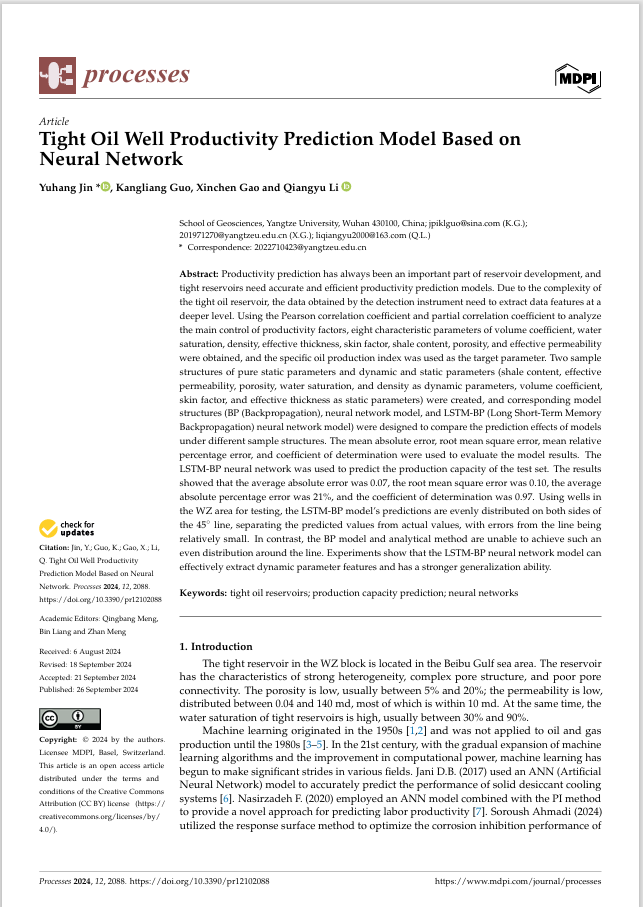 近日,英国威廉集团地质学专业2022级研究生金宇航在SCI三区期刊《Processes》(IF=2.8)发表题为"Tight Oil Well Productivity Prediction Model Based on Neural Network"的研究论文。英国威廉集团为论文第一署名单位,研究生金宇航为论文第一作者,其导师郭康良教授为通讯作者。