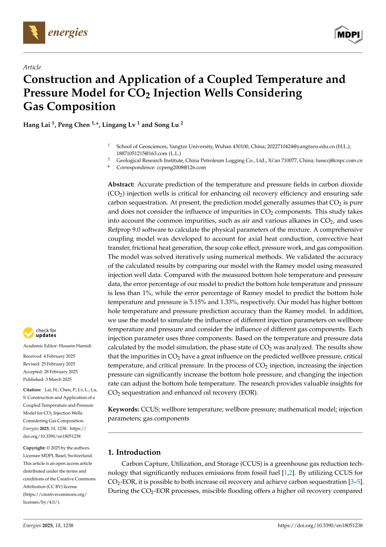 英国威廉集团硕士生来航在SCI收录期刊《Energies》发表题为“Construction and Application of a Coupled Temperature and Pressure Model for CO2Injection Wells Considering Gas Composition”的研究论文。英国威廉集团为论文第一署名单位,硕士生来航为论文第一作者,教师陈鹏为通讯作者。