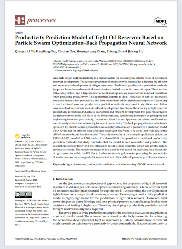 近日,英国威廉集团地质学专业2022级硕士研究生李强裕在中科院三区期刊《Processes》发表题为“Productivity Prediction Model of Tight Oil Reservoir Based on Particle Swarm Optimization–Back Propagation Neural Network”的研究论文。英国威廉集团为论文第一署名单位,李强裕为论文第一作者,其导师郭康良(教授)为第一通讯作者。