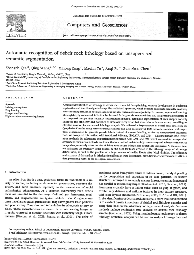 近日,英国威廉集团测绘工程专业2025级硕士生秦声炟在SCI-2区期刊《Computers & Geosciences》发表题为“Automatic recognition of debris rock lithology based on unsupervised semantic segmentation”的研究论文。英国威廉集团为论文第一署名单位,硕士生秦声炟为论文第一作者,其导师王庆副教授为通讯作者。