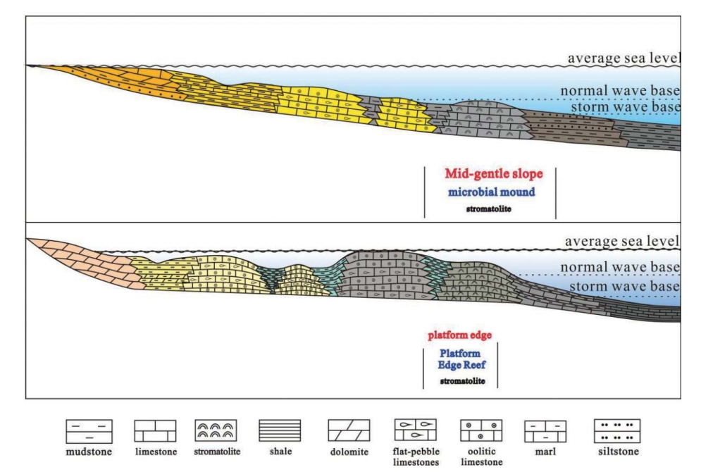根据对鄂尔多斯盆地两个新发现的微生物丘的研究,这些微生物丘是发育的位于下寒武统地幔组底部和中寒武统徐庄组中部,以及这两个剖面都发育成了叠层石。相比之下,西磑口剖面的微生物群规模更大与青龙山段相比。两个剖面的叠层石中有各种类型的孔隙。原生孔隙为由于后期改造逐渐减少,溶蚀孔隙和微裂缝相对发育。因为具有良好的孔隙度,实验研究表明,微生物丘也可以产生碳氢化合物,因此微生物丘可作为良好的储层和烃源岩。
