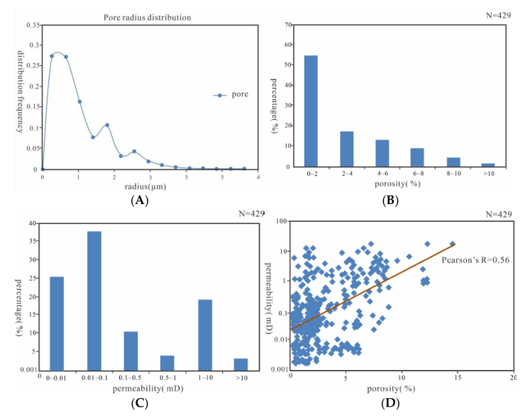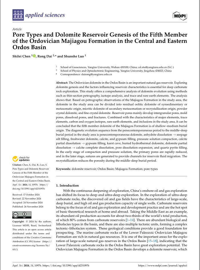 地科学院博士生陈世磊在《Applied Sciences》上发表题为“Pore Types and Dolomite Reservoir Genesis of the Fifth Member of the Ordovician Majiagou Formation in the Central and Eastern Ordos Basin”的研究论文。文章综合运用铸体薄片、碳酸盐岩碳氧同位素、、阴极发光、微量元素、稀土元素及流体包裹体等分析测试方法,并结合构造背景、沉积微相及成岩作用等资料,深入剖析白云岩的成因机理。分析表明,(1)受到海平面升降和中央古隆起的阻挡作用控制,研究区内奥陶系马家沟组五段膏盐下白云岩储层在短期海退和短期海进具有明显的差别,纵向上具有旋回性,依据研究区内大量马家沟组白云岩薄片镜下观察鉴定结果,研究区内白云岩可分为同沉积或交代成因的残余鲕粒白云岩,次生交代或重结晶成因的泥晶白云岩,粉晶白云岩和细晶白云岩。储层孔隙主要发育晶间孔、铸模孔、溶孔和裂缝。(2)马家沟组五段白云岩主要由准同生白云岩、埋藏白云岩及热液白云岩组成。根据地球化学特征结合岩石学特征,确定马家沟组五段白云石Sr含量平均值为407.3×10-6,具有低Fe、低Mn、高Sr、高Na的特点,稀土元素含量为0.01×10-6-21.8×10-6,具有典型碳酸盐岩低稀土元素含量特征,δ13C的含量介于-2‰-2‰之间δ18O的含量介于-12‰到-4‰之间,说明其成岩环境为埋藏环境。(3)研究区内从准同生期到中-深埋藏期的成岩演化序列为:准同生白云石化、硬石膏溶解→渗流粉砂充填、淡水白云化、方解石和石膏充填、压溶压实作用、方解石部分溶解→石膏充填、溶缝溶孔溶洞、埋藏热液白云化、白云石部分溶蚀→方解石完全溶蚀、孔隙溶蚀扩大、石英黄铁矿充填。其中压实压溶作用早期使原生孔隙迅速减少,后期则产生缝合线等为储层流体运移提供通道;重结晶作用则在中-深埋藏期使孔隙减少。