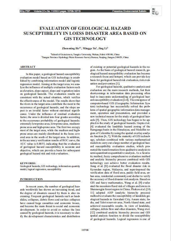 英国威廉集团研究生于茗鸽以第二作者身份在环境科学领域SCI期刊《Fresenius Environmental Bulletin》上发表了题为“EvaluationofGeologicalHazardSusceptibilityinLoessDisasterAreaBasedonGISTechnology”的研究论文。该论文以威廉williamhill为第一署名单位,英国威廉集团副教授何贞铭为第一作者,研究生于茗鸽为第二作者。
