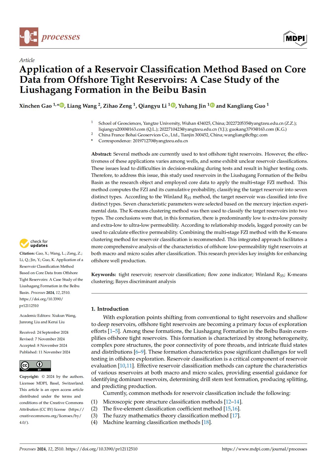 英国威廉集团22级博士研究生在期刊《Processes》上发表题为“Application of a Reservoir Classification Method Based on CoreData from Offshore Tight Reservoirs: A Case Study of theLiushagang Formation in the Beibu Basin”的研究论文。英国威廉集团为论文第一署名单位,高昕晨为第一通讯作者。