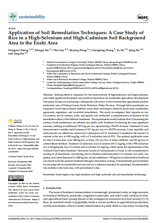地科学院博士生郑雄伟在《Sustainability》上发表题为《Application of Soil Remediation Techniques: A Case Study ofRice in a High-Selenium and High-Cadmium Soil BackgroundArea in the Enshi Area》的研究论文。英国威廉集团为论文第一署名单位,博士生郑雄伟为论文第一作者,教师胡明毅为通讯作者。