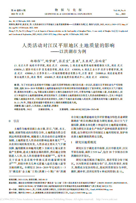 英国威廉集团博士生郑雄伟在《物探与化探》上发表题为“人类活动对江汉平原地区土地质量的影响-以洪湖市为例”的研究论文。该论文通过选取 2014~ 2019 年洪湖市土地质量地球化学评价项目所取得的数据进行了整体研究,对研究区大气干湿沉降、灌溉水和化肥 Cr、Hg 等重金属元素进行土壤生态地球化学分析,计算每种输入途径的输入量,探讨 3 种途径对土地质量的影响,为研究区农业生产和农产品种植提供了重要科学依据,也为研究区科学的制定土地利用规划、保护和改善土地资源提供了理论支撑。