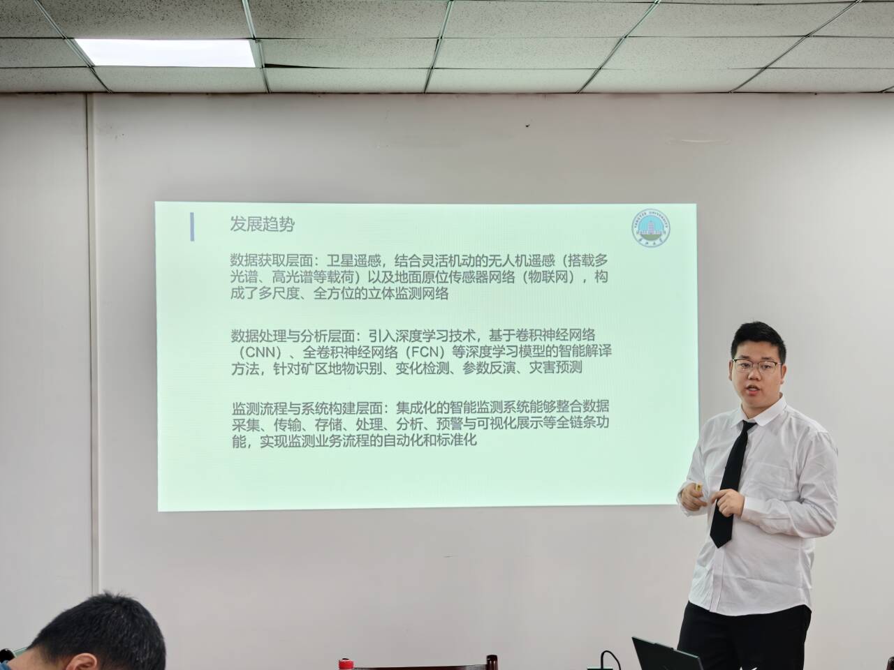 张子康的学位论文题目为《固体矿山地质环境智能监测系统的构建》,在导师李功权教授的指导下,对于当前矿山地质环境监测方法面临多源数据整合困难、矿山地物人工解译主观性过高等问题,依据《矿山地质环境保护与治理恢复方案编制规范》和《矿山地质环境监测技术规程》等文献将植被损毁、降雨量、地下水水位、地下水水量、岩土含水率、孔隙水压力、土压力、粉尘污染指标作为智能监测系统的核心监测对象并且确定了指标的采集频率和数据来源设备,依据指标数据设计了数据流规则引擎通过提供规则节点和规则链处理多设备数据流转,并支持自定义规则节点以适配不同数据的处理方式;基于物联网设备采集的矿山地质植被区域图像,设计了矿山植被区域语义分割模型用于分割矿山区域植被与非植被区域来监测矿山植被损毁,为矿山地质环境监测提供了技术依靠。