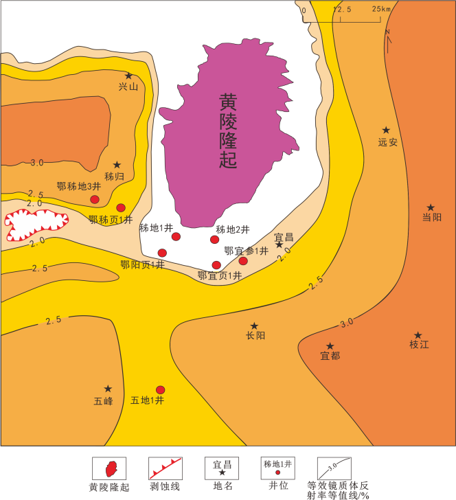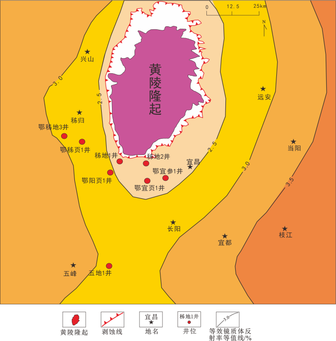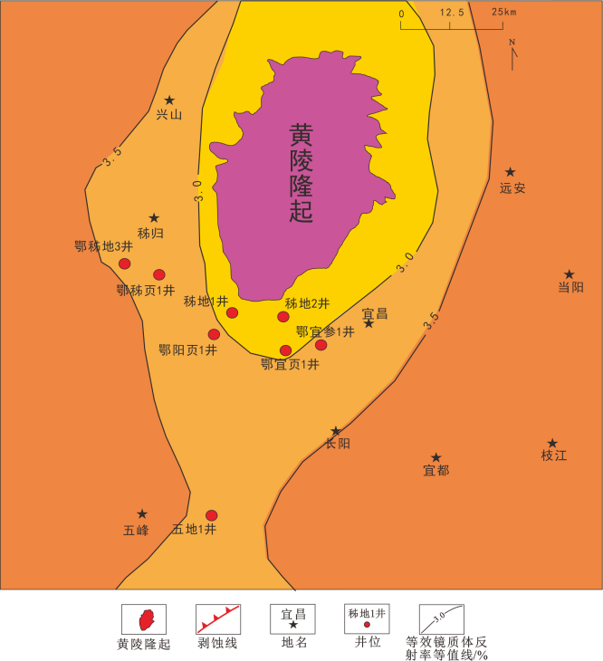 图3黄陵隆起及周缘地区牛蹄塘组页岩热成熟度平面分布图