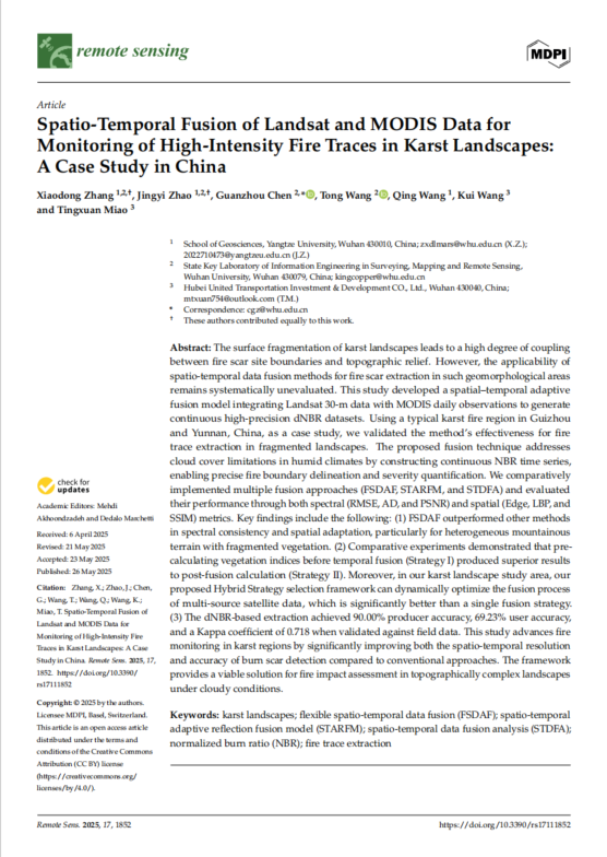 近日,英国威廉集团地图制图学与地理信息工程专业2022级研究生赵菁怡在SCI期刊《REMOTE SENSING》发表题为“Spatio-Temporal Fusion of Landsat and MODIS Data for Monitoring of High-Intensity Fire Traces in Karst Landscapes: A Case Study in China”的研究论文。英国威廉集团为论文第一署名单位,学生赵菁怡与导师张晓东教授为论文第一作者,导师王庆副教授为共同作者。