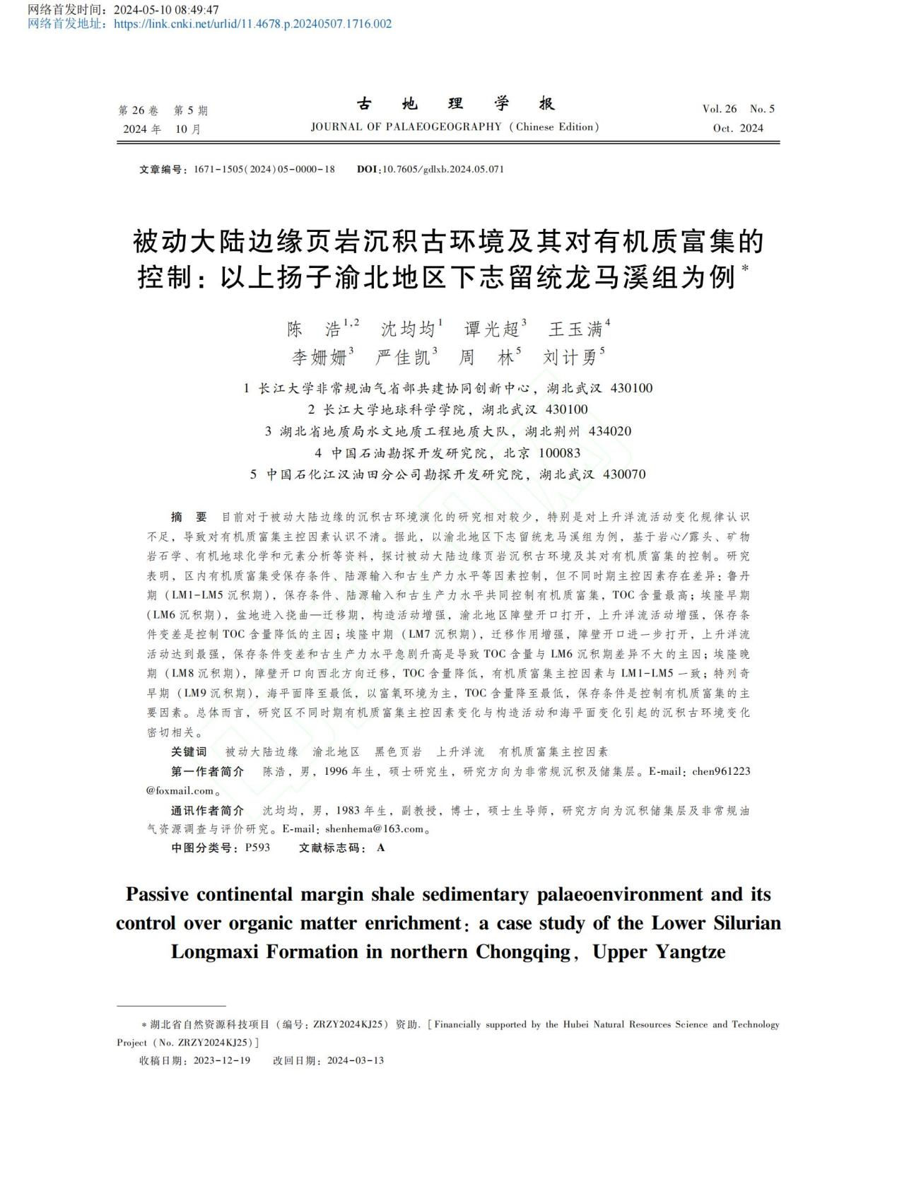 地科学院研究生陈浩以第一作者身份在北大核心期刊《古地理学报》上发表题为“被动大陆边缘页岩沉积古环境及其对有机质富集的控制:以上扬子渝北地区下志留统龙马溪组为例”的研究论文,威廉williamhill非常规油气省部共建协同创新中心和英国威廉集团为论文第一署名单位。副教授沈均均为通讯作者。