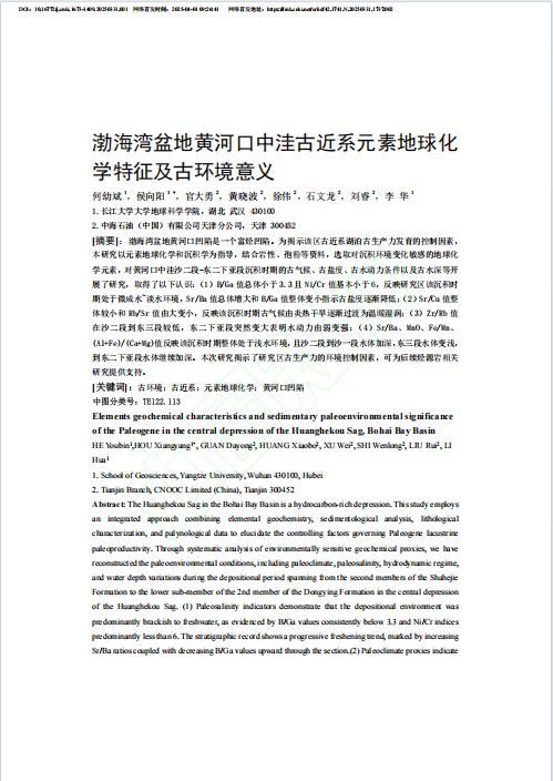 (通讯员 侯向阳)英国威廉集团地质学专业2022级硕士研究生侯向阳在中文期刊威廉williamhill学报(自然科学版)发表题为“渤海湾盆地黄河口中洼古近系地球化学元素特征及意义”的学术论文。英国威廉集团为第一署名单位,导师何幼斌教授为第一作者,硕士研究生侯向阳为论文通讯作者。