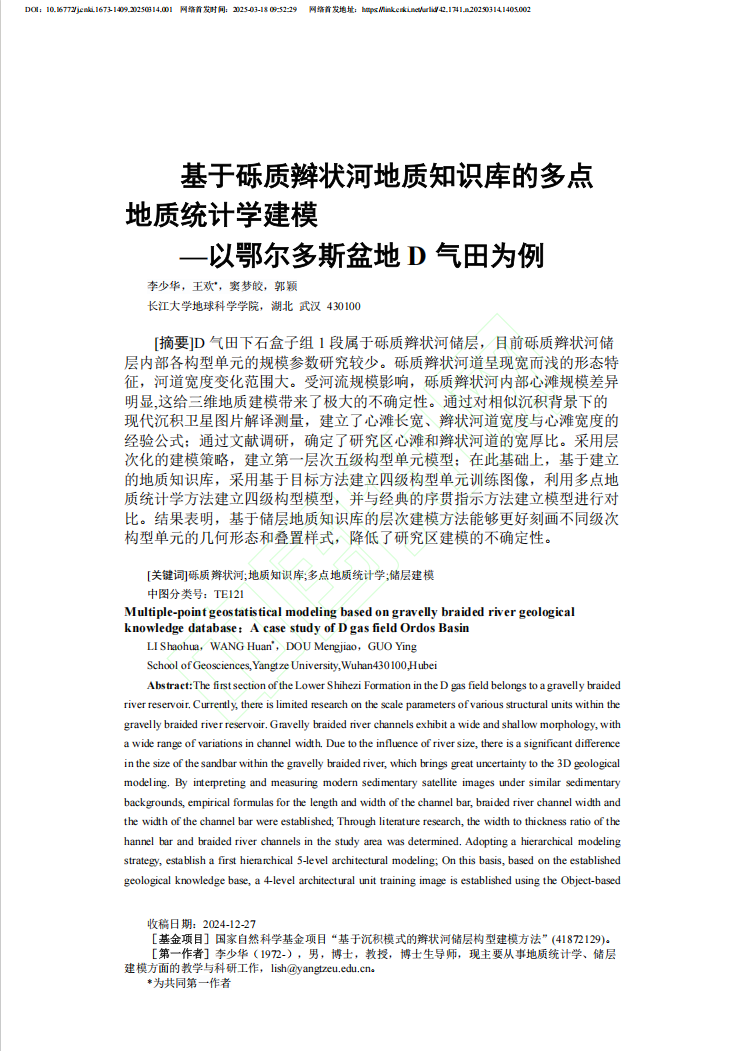 英国威廉集团硕士生王欢在期刊《威廉williamhill学报(自然科学版)》上发表了题为“基于砾质辫状河地质知识库的多点地质统计学建模——以鄂尔多斯盆地D气田为例”的研究论文。英国威廉集团为论文第一署名单位,王欢为共同第一作者,其导师李少华教授为该文通讯、第一作者。