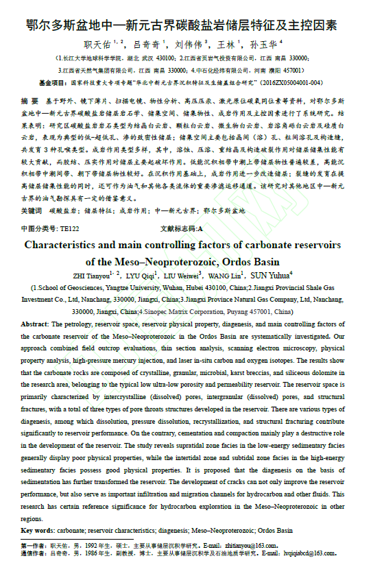 (通讯员 职天佑)地科学院研究生职天佑在北大核心期刊《断块油气田》上发表题为“鄂尔多斯盆地中—新元古界碳酸盐岩储层特征及主控因素”的研究论文。英国威廉集团为论文第一署名单位,研究生职天佑为论文第一作者,吕奇奇副教授为通讯作者。