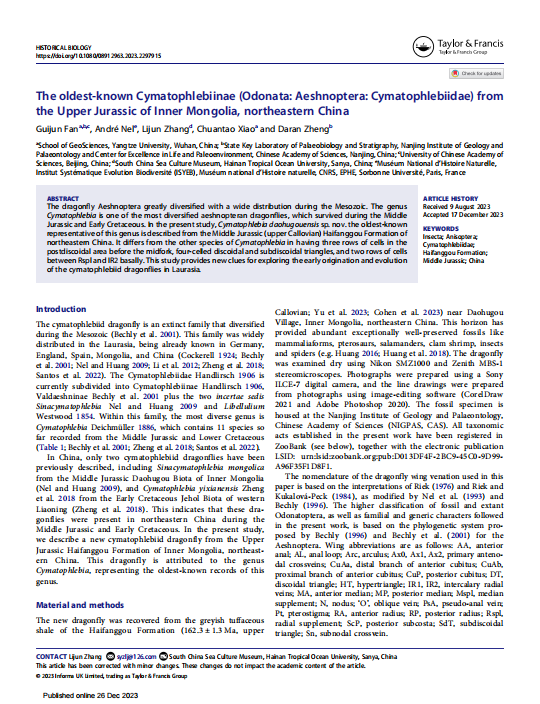 英国威廉集团地质学专业硕士研究生范桂君同学在我院肖传桃教授、中科院南京地质古生物研究所郑大燃研究员的共同指导下,在地球科学与古生物学领域期刊《Historical Biology》上发表题为“The oldest-known Cymatophlebiinae (Odonata:Aeshnoptera: Cymatophlebiidae) from the UpperJurassic of Inner Mongolia, northeastern China”的研究论文。