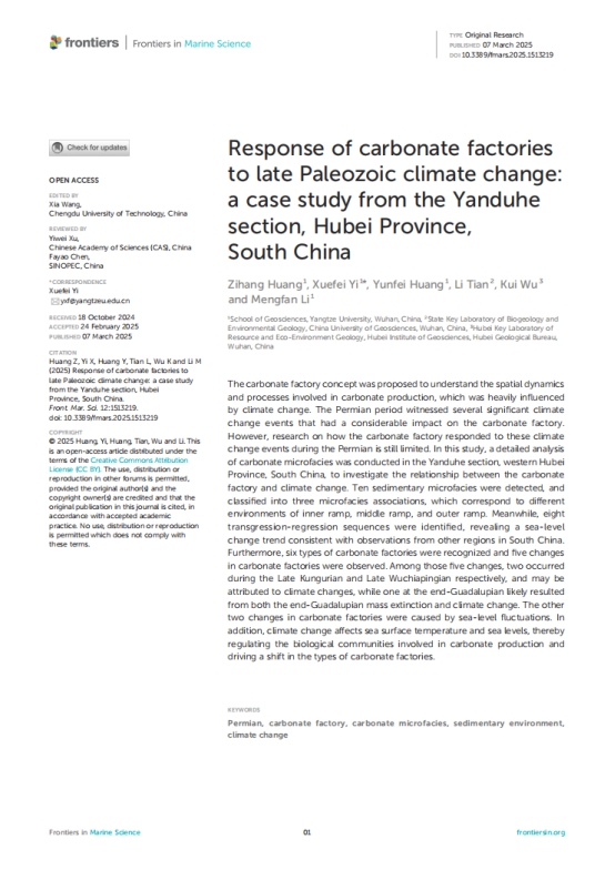 地科学院2022级研究生黄子航在海洋与淡水生物学国际2区SCI期刊《Frontiers in Marine Science》上发表题为“Response ofcarbonatefactories tolate Paleozoicclimatechange:acasestudy from the Yanduhe section, HubeiProvince, South China”的研究论文。英国威廉集团为论文第一署名单位,硕士研究生黄子航为论文第一作者,其导师易雪斐副教授为通讯作者。
