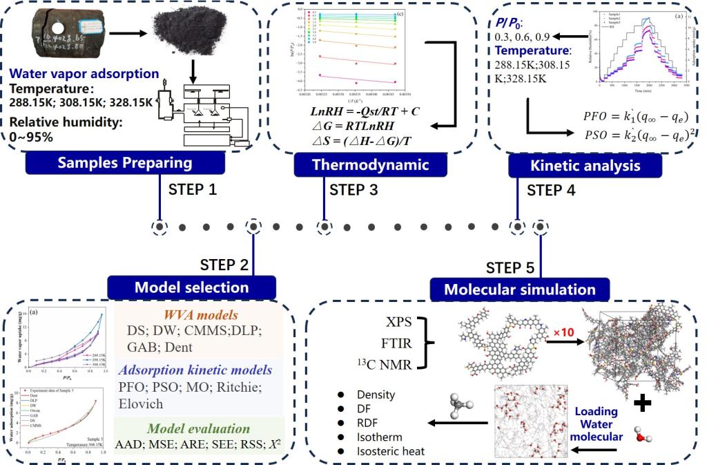 富有机质页岩储层孔隙中普遍含水,明确水在页岩有机质中的赋存特性,对于进一步探讨页岩储层微观气水分布、提高页岩气采收率等问题具有重要的理论和实践意义。本次研究以川南龙马溪组页岩干酪根为研究对象,通过热解、激光拉曼光谱、水蒸气吸附(WVA)实验方法与分子动力学模拟,开展了GAB、Dent等7种热力学模型及PFO、PSO等5种动力学模型的拟合分析;明确了不同温度下干酪根对水蒸气的吸附量与热力学参数(ΔH、ΔG、ΔS)关系,揭示了不同含水量对甲烷吸附量和吸附热的控制作用。