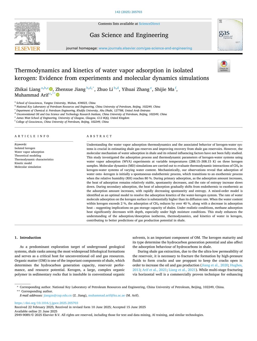 英国威廉集团石油系梁志凯特任副教授以第一作者身份在《Gas Science and Engineering》上发表题为“Thermodynamics and kinetics of water vapor adsorption in isolated kerogen: Evidence from experiments and molecular dynamics simulations”的研究论文,英国威廉集团为论文第一署名单位。