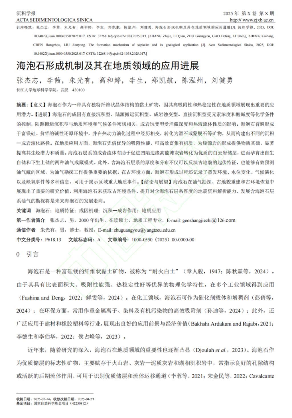 近日,英国威廉集团24级研究生张杰志在核心期刊《沉积学报》上发表了题为《海泡石形成机制及其在地质领域的应用进展》的论文(共32页)。全部作者均来自英国威廉集团师生,研究生张杰志为论文第一作者,其导师朱光有教授为通信作者。论文重点讨论了海泡石的地质特征、成因机制、沉积—成岩的关系以及在地质领域的应用。