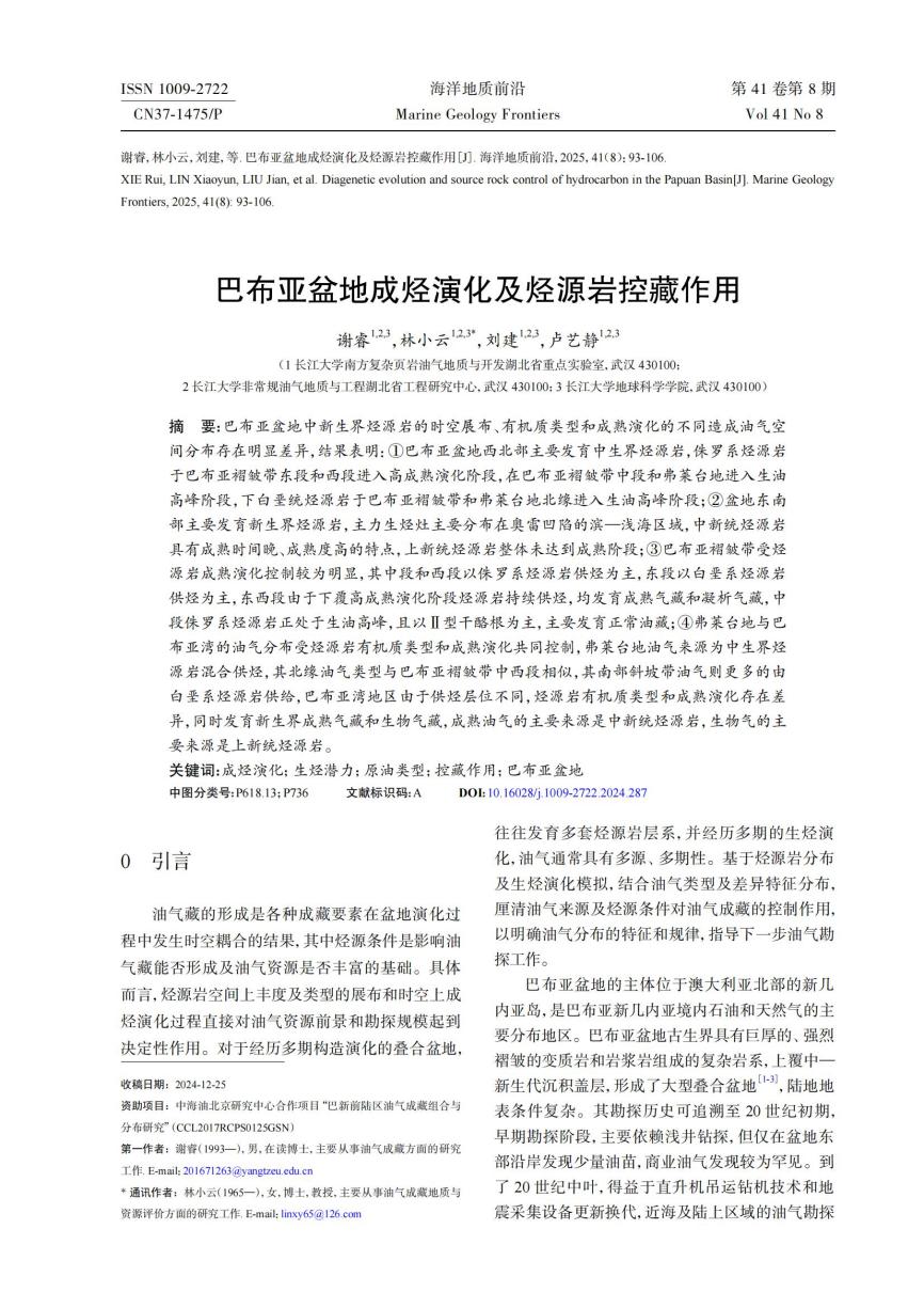 近日,英国威廉集团博士研究生谢睿在核心期刊《海洋地质前沿》上发表题为《巴布亚盆地成烃演化及烃源岩控藏作用》的论文(共13页),全部作者均来自英国威廉集团师生,研究生谢睿为论文第一作者,其导师林小云教授为通信作者。论文重点讨论了巴布亚盆地的烃源岩发育特征、热演化特征及其对油气分布的控制作用。