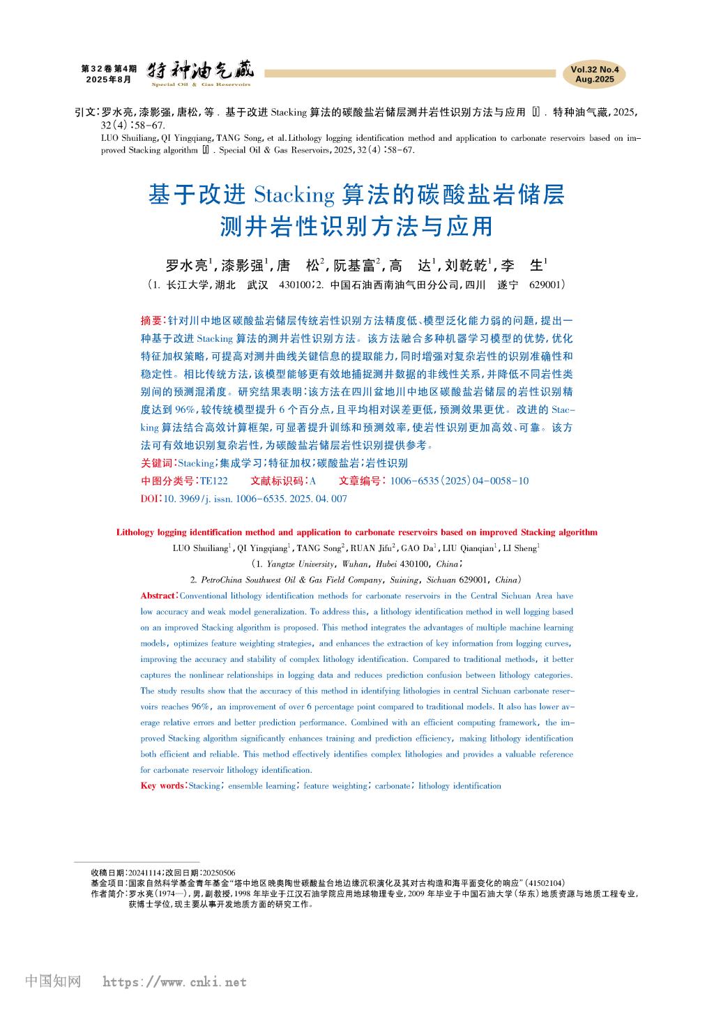 论文信息:罗水亮,漆影强,唐松,等.基于改进Stacking算法的碳酸盐岩储层测井岩性识别方法与应用[J].特种油气藏,2025,32( 4) : 58-67.